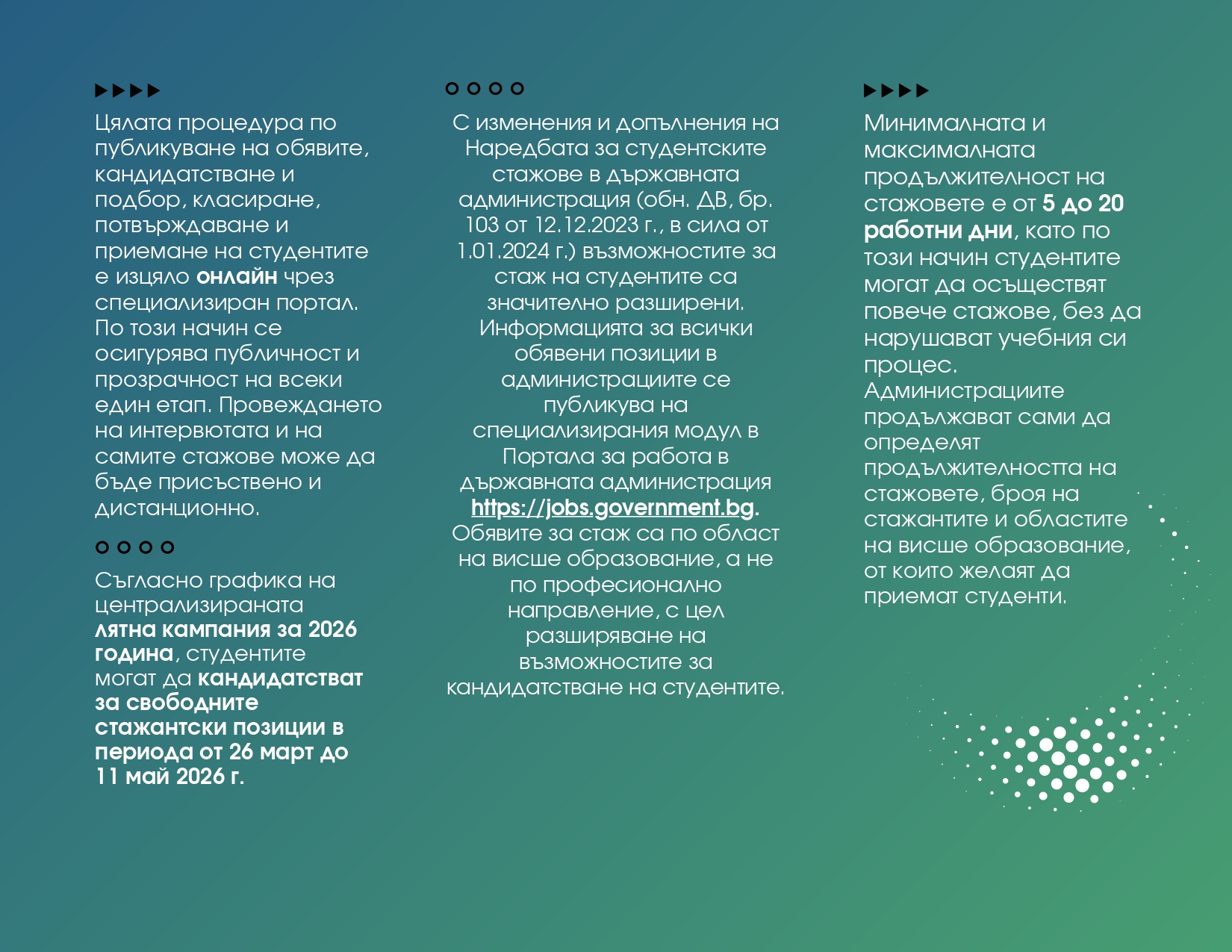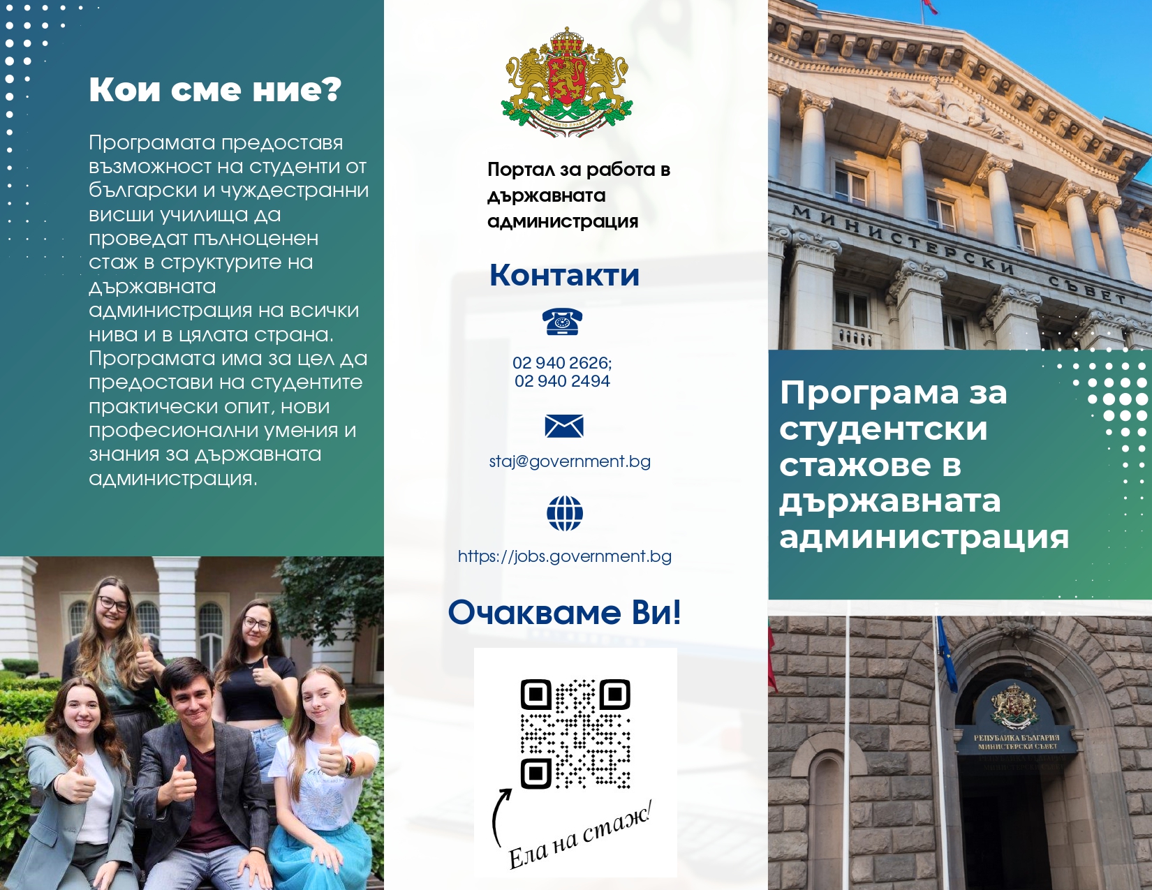 На семинара ще бъде представена обновената програма за Студентски стажове в държавната администрация, и по специално Централизираната лятна кампания за студентски стажове, която стартира от март месец 2026 г. на всички нива и в цялата страна. Стажовете ще се проведат през летните месеци - юли август и септември, след като студентите се регистрират на сайта https://jobs.government.bg/PJobs/ и кандидатстват за обявените позиции в периода 26 март до 11 май 2026 г. Стажантската програма има за цел да предостави на студентите практически опит, нови професионални умения и да ги запознае с държавната администрация, както и с възможностите за кариерно развитие след завършване на Нов български университет.